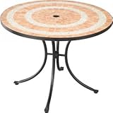 The Valencia Dining Table top is constructed of small, square and triangular, terra cotta tiles with river stone in a ringed pattern. The table top also features a center opening that can be used for an umbrella or can be closed with the included black cap for a continuous surface. The cabriole designed base is constructed of steel in a Black finish. Adjustable, nylon glides prevent damage to surfaces caused by movement and provide stability on uneven surfaces. Item Dimensions: 39.5 x 39.